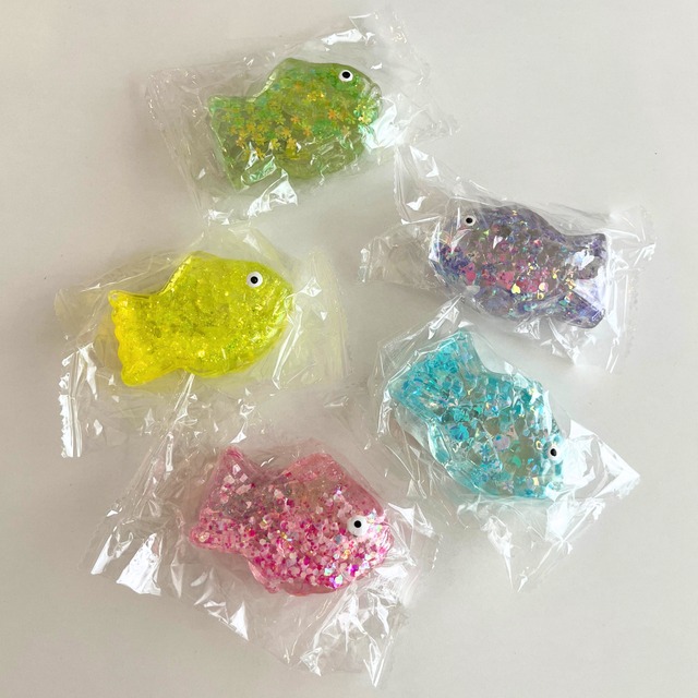 もちっとした柔らかい感触がクセになる、たいやき型のスクイーズ。 手のひらサイズでキラキラのラメがたくさん入っています。 ・使用上のご注意 食べ物ではありません。誤嚥、窒息の恐れがありますので口に入れたり食べたりしないでください。 ご使用後はお子様の手の届かないところへ保管してください。 ※対象年齢6歳以上